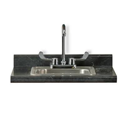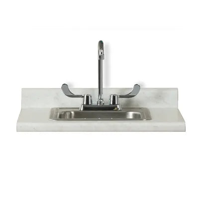 A stainless steel sink and chrome, wing lever faucet is standard with all postform countertops. The faucet is 14.5” high with a 3” radius.
