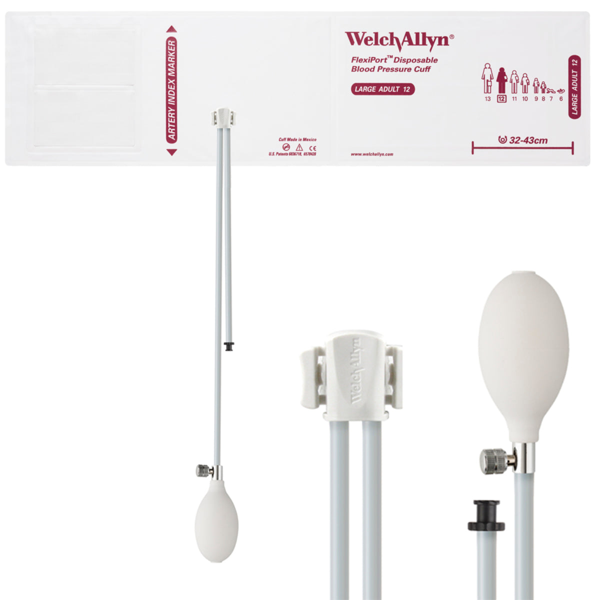 Welch Allyn FlexiPort Blood Pressure Cuff; Size-12 Large Adult, Soft Disposable, 2-Tubes (8.0 and 13.0 in/20.3 and 33.0 cm), Tri-Purpose (#5082-168) Connector and Inflation Bulb and Valve; with Inflation Bulb and Valve; Qty. 20