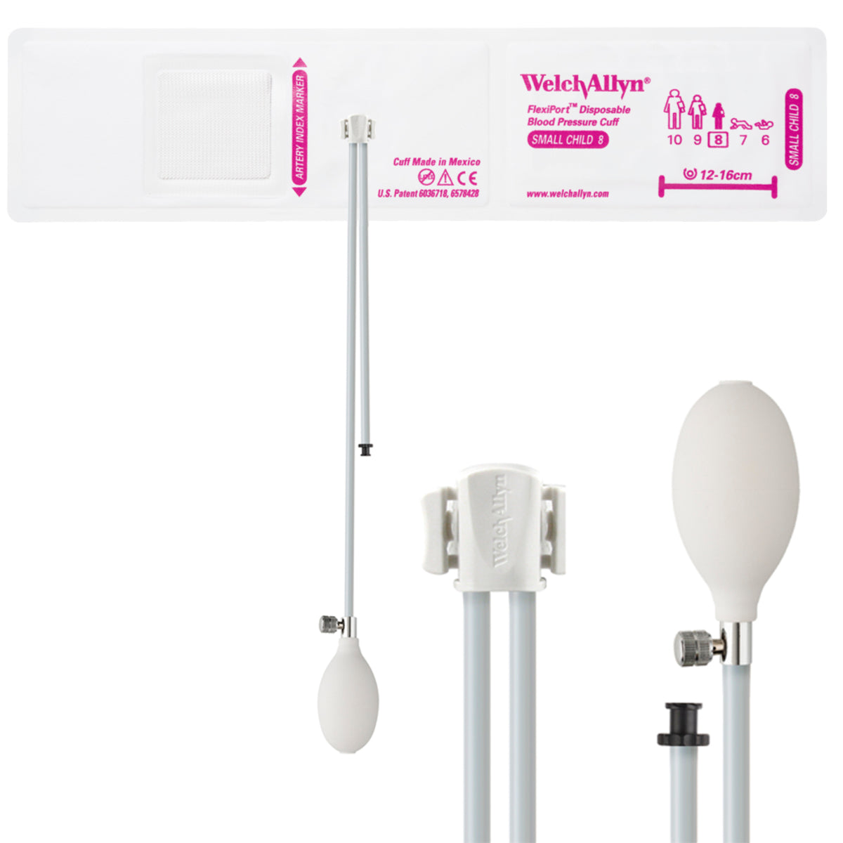 Welch Allyn FlexiPort Blood Pressure Cuff; Size-08 Small Child, Soft Disposable, 2-Tubes (8.0 and 13.0 in/20.3 and 33.0 cm), Tri-Purpose (#5082-168) Connector and Inflation Bulb and Valve; with Inflation Bulb and Valve; Qty. 20