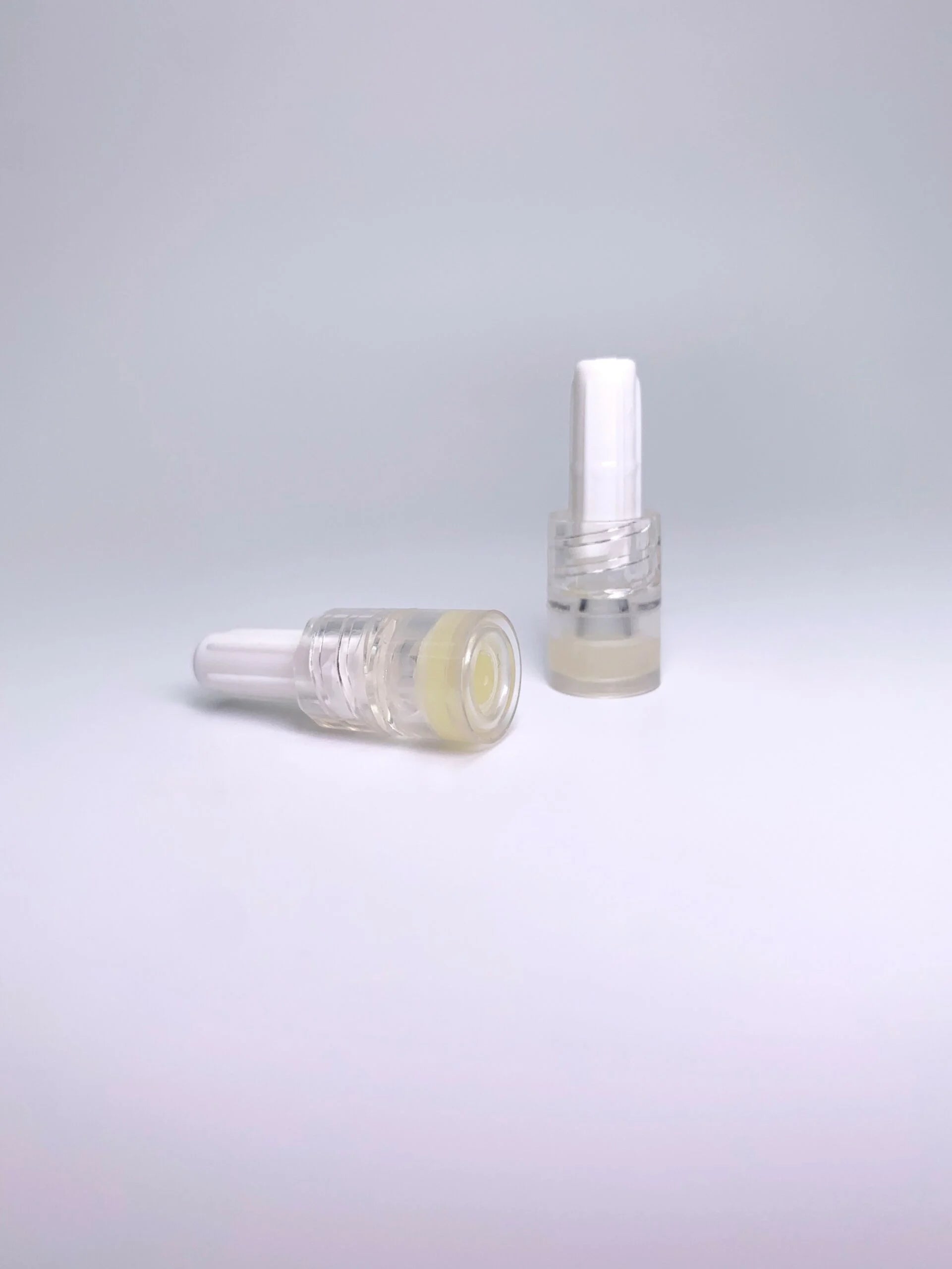 The injection cap is a male Luer slip-fitting with a latex-free stopper. The cap provides a self-sealing injection site for administering medications through Luer-slip catheter adapters (connectors).