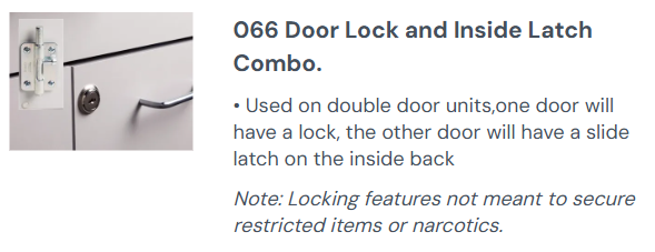 • Used on double door units, one door will have a lock, the other door will have a slide latch on the inside back