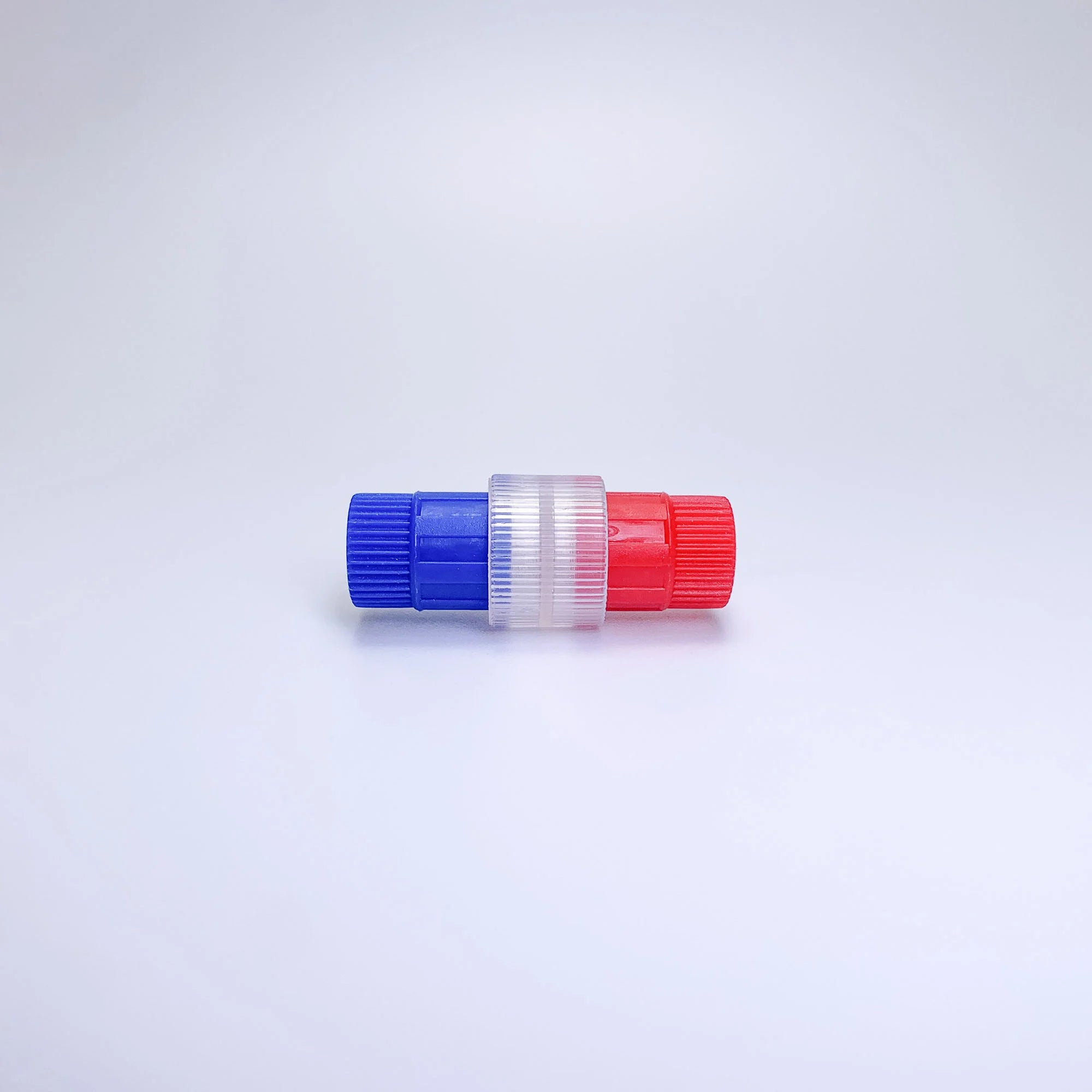 The MPC-135 contains (2) MPC-124 style caps (1) red and (1) blue seated neatly on a hub to save time and money. The caps provide a non-injectable end cap. Use top cap off female luers. These sterile care are not vented and do not have an access port.