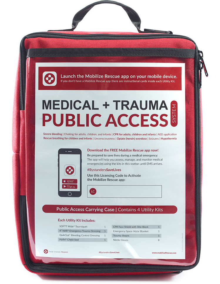 The Mobilize Rescue Systems by ZOLL Medical provide essential public access rescue supplies for trauma and cardiac arrest situations. The UTILITY and PUBLIC ACCESS kits each include a single user app license for downloading the app to a smartphone, while the COMPACT kit comes with a multi-user license for the app. These systems are designed to assist untrained bystanders in assessing, managing, and monitoring medical emergencies by following protocols and best practices from the American Heart Association (AHA), Tactical Emergency Casualty Care (TECC), and the American College of Surgeons.