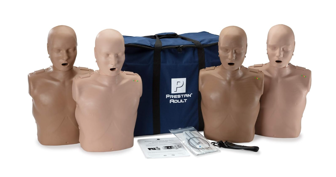 PRESTAN Professional Adult CPR Training Manikins 4-Pack (installed with Rate Monitor and Depth Clicker for CPR Feedback). Includes 50 Adult Face-Shield/Lung-Bags, an Instruction Sheet and Carry Bag.
