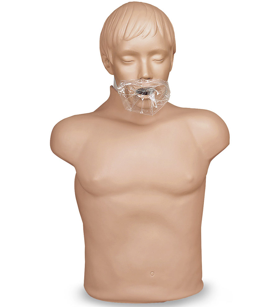 Sani CPR manikins have an easy-to-install single-use airway/face shield combination. Anatomical landmarks include the sternum, the rib cage, and the substernal notch. These manikins also simulate realistic head tilt and chin lift, which are necessary for opening the airway. The chest rises to demonstrate a successful rescue breath. The airway/face shield system can be changed very quickly. Using the economical, disposable airway/face shield avoids cross-contamination and does not require cleaning, disinfecting, or disassembly. The carry bag is not included. The manikin is not made with natural rubber latex.